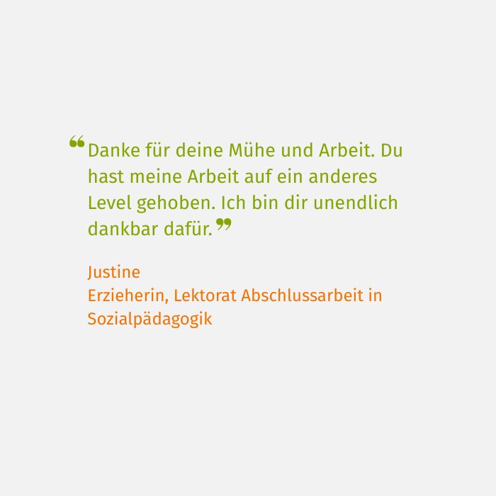 Deine Arbeit ist zwar fertig, aber vor der Abgabe wünschst du dir einen professionellen Blick auf deine Gliederung, die Leitfrage und die Stringenz deiner Argumentation. Dann empfehle ich dir ein Lektorat.